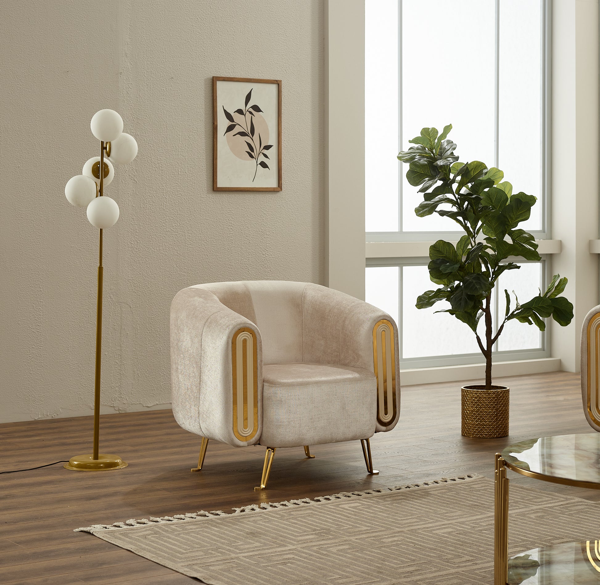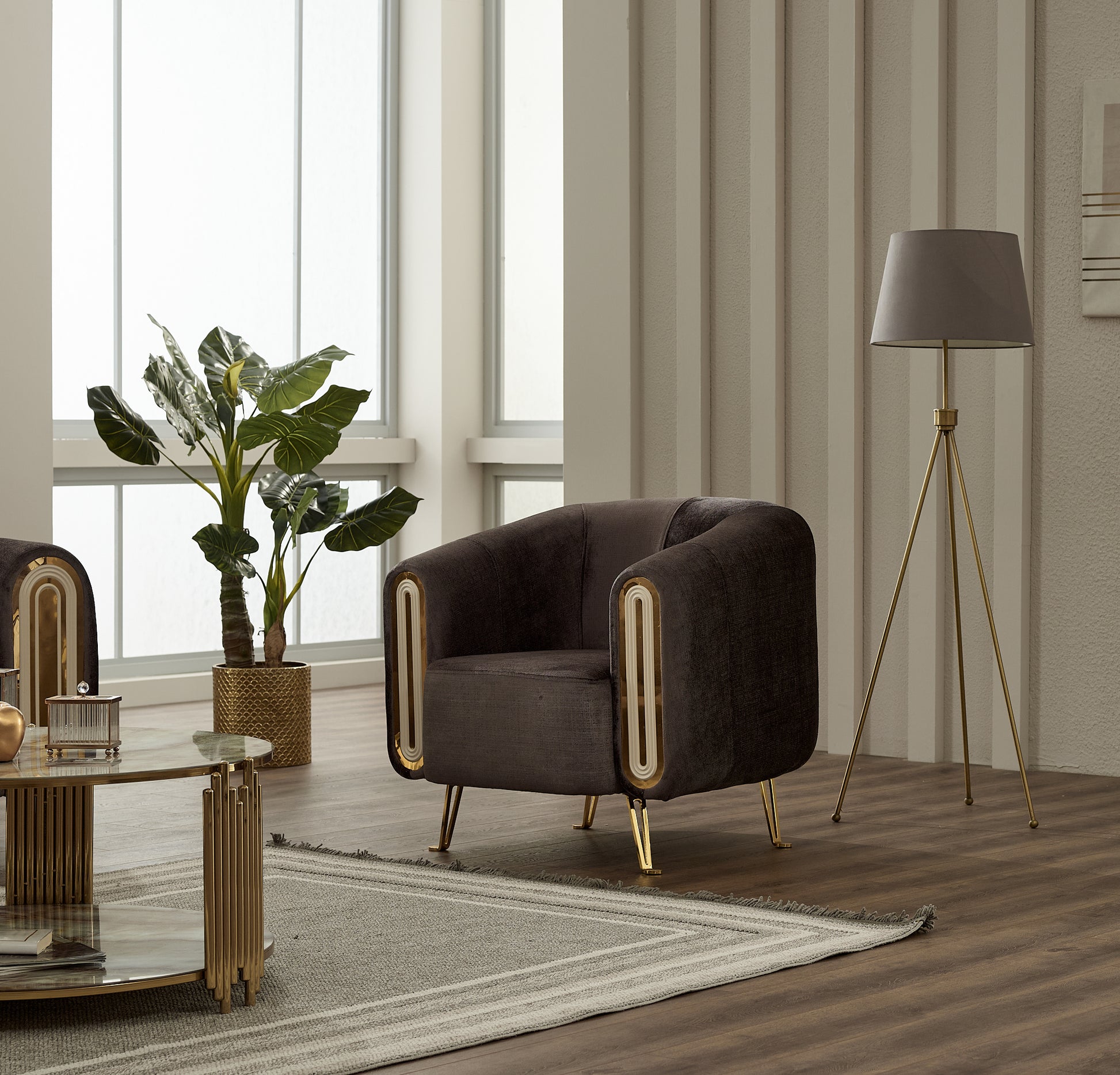 Gold Detailing: Elegant gold accents on the armrests and base for a statement finish.