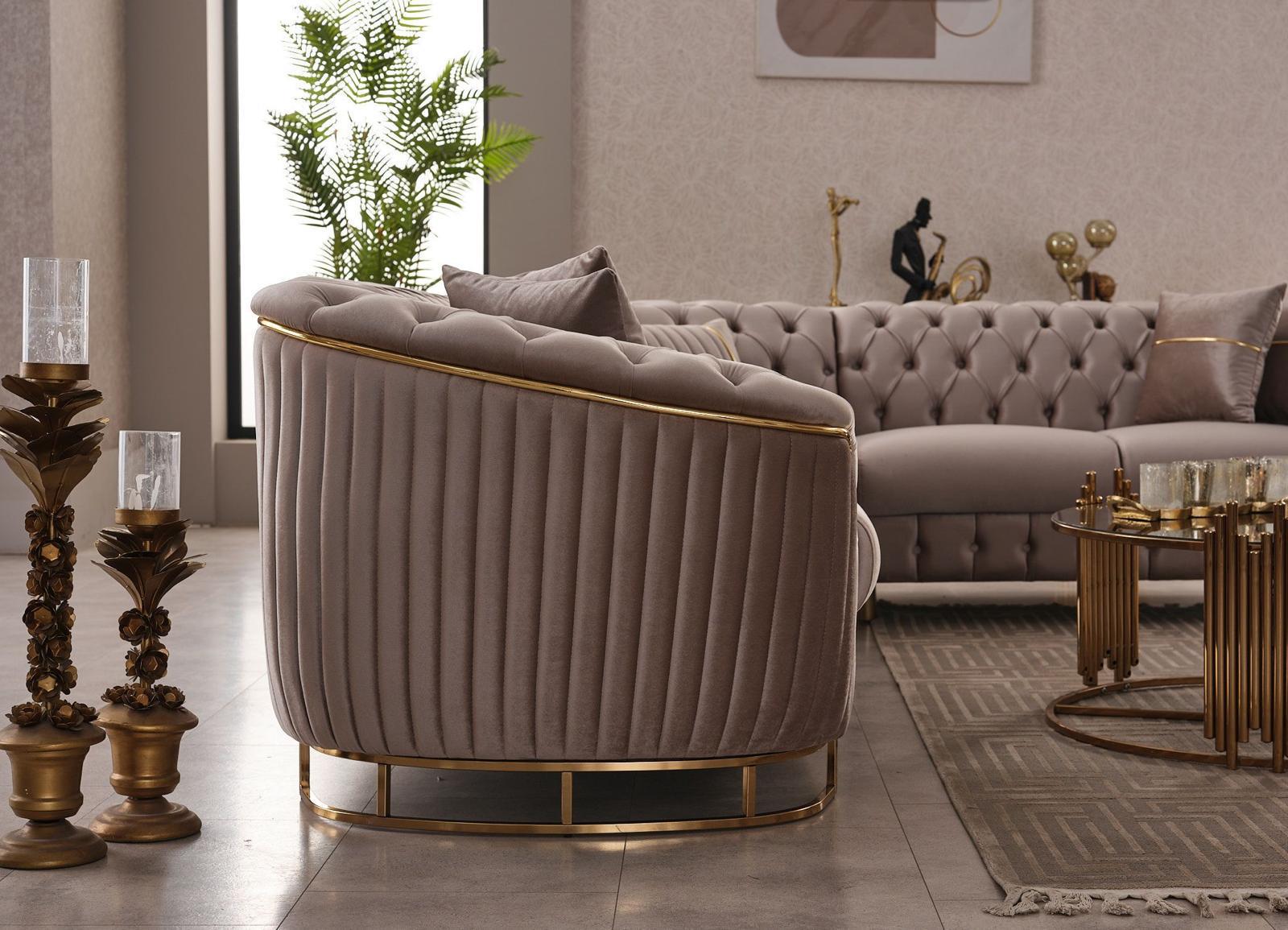 Gold Detailing: Elegant gold accents on the armrests and base for a statement finish.
